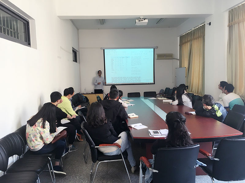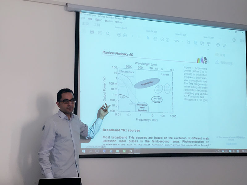 会上,Dr. Shalaby Mostafa首先通过THz和可见光对牙齿、钥匙成像问题简单介绍了THz在成像方面的应用,接着阐释了THz波的指纹特性,并展示了DAST、DSTMS、OH1等能够产生THz的有机非线性光学晶体。报告结束后,他就师生们提出的利用晶体所产生THz的半峰宽与晶体特性的关系、光子晶体与THz之间的关系、产生THz所用晶体的最佳尺寸等问题做了详细解答。
