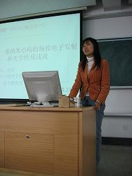 赵清是h动漫 1997级应用物理学专业学生,2001年考入北京大学凝聚态物理专业硕士研究生,并直读博士研究生。现在美国Univ. Washington 从事博士后研究。赵清同学师从俞大鹏教授,从事“准一维宽禁带半导体纳米结构的制备及物理性质测量”的研究,已在国际性的学术刊物上发表数篇高质量的学术论文,曾获得过“北大研究生学术十杰”的荣誉。图为赵清在北京大学物理学院“萃英”研究生学术沙龙第一期上做主讲人。