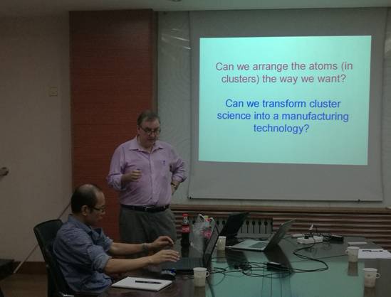 Richard E. Palmer教授在报告中详细介绍了金属团簇尺寸控制的方法、原子构型的探测、金属团簇结构演化规律等方面的研究。报告会后,Palmer教授与h动漫