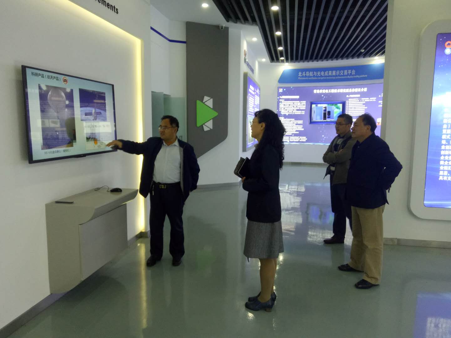 大家首先参观了光电与北斗导航科技成果展示平台,了解了青岛光电院的科研、产业化和科技服务的情况以及研究院五个技术方向及其相关的科研成果,并就有合作前景的部分科研方向和成果,与技术人员进行了沟通和交流。