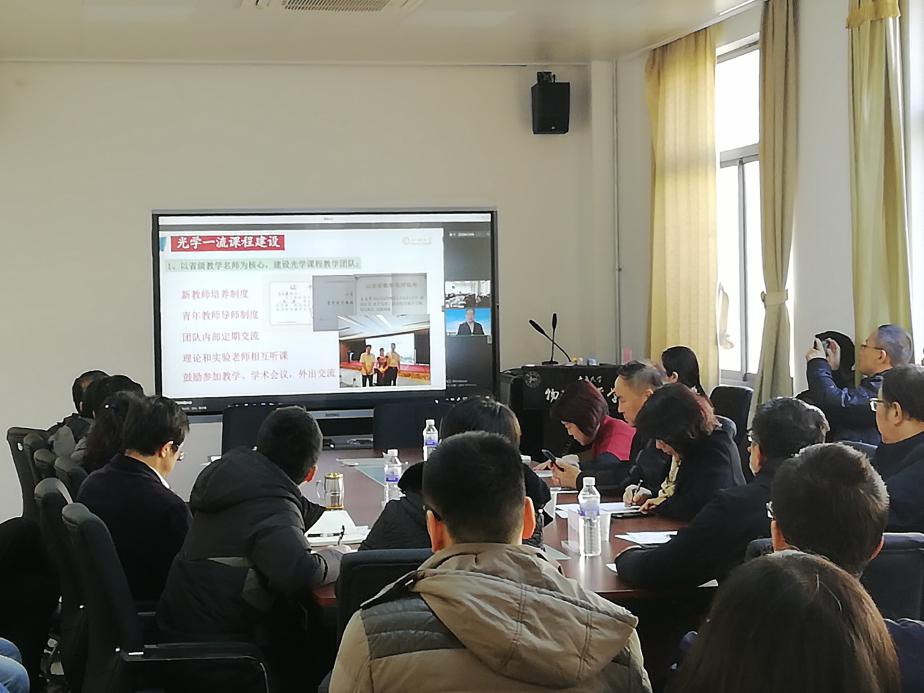 2019线下省级一流课程《物理光学》课程负责人云茂金教授就课程申报书、支撑材料、视频录制等情况进行了介绍。教育部物理教学指导委员会委员王霞教授从评委的角度对课程提出了指导建议,指出立项课程负责人要组织好团队,合理分工协调,提升团队成员的协作能力。山东物理学会秘书长张承琚教授指出,在课程建设中必须突出课程特色和亮点,改革教学方法与手段,发挥学生的主体作用,并重视教材建设。