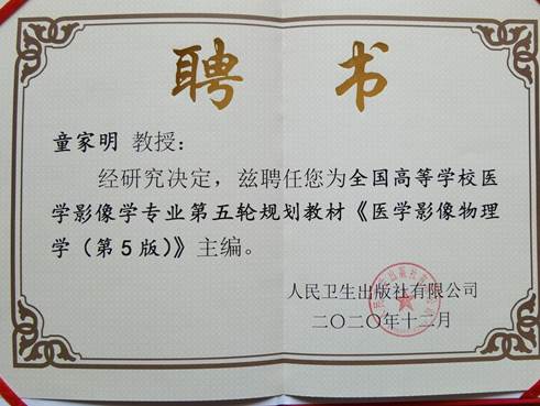 童家明教授被聘任为全国高等学校医学影像学专业第五轮规划教材《医学影像物理学(第5版)》主编。据悉,全国高等学校医学影像学专业第五轮规划教材拟定于2022年5月出版发行,供全国院校教学选用。