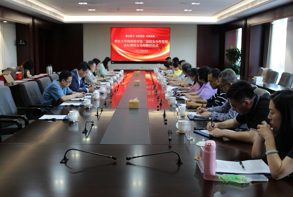 于浮山校区会议中心举办物理教育第二届校友合作发展论坛暨校友导师聘任仪式。本次活动以“校友聚力 名师领航 共谋发展”为主题,旨在凝聚校友资源、深化合作交流。学院党委书记郝伟,副院长张永成、张军,青岛市教科院、青岛第七中学、青岛第五十九中学等基础教育一线优秀校友代表,以及物理教育系师生代表20余人参加活动。会议由学院党委副书记董永红主持。