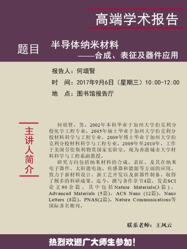 2017物理前沿学术报告第三十一讲:半导体纳米材料——合成、表征及器件应用