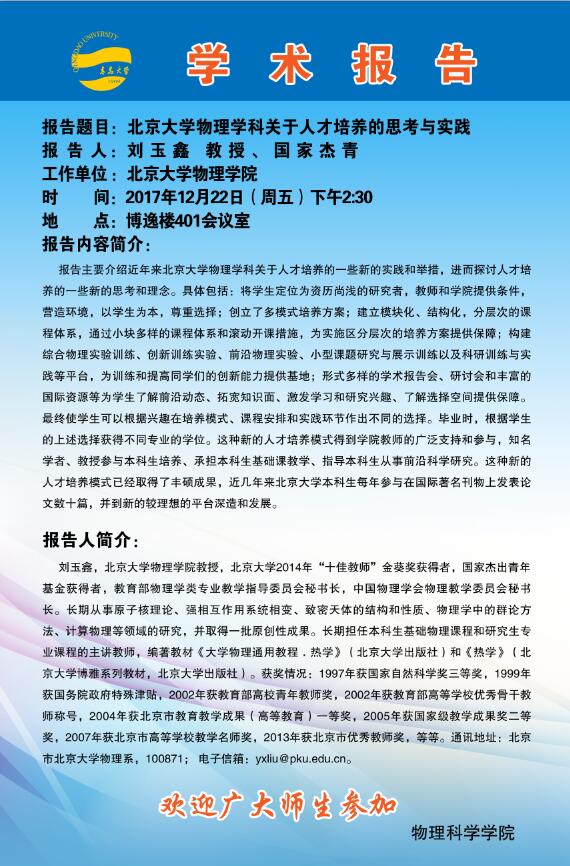 2017物理前沿学术报告第四十九讲:北京大学物理学科人才培养的理念与实践