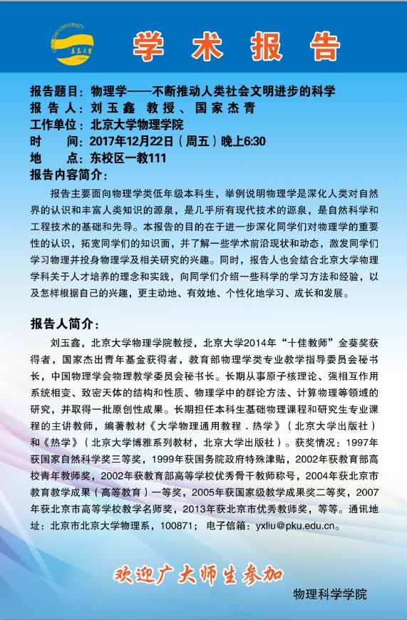 2017物理前沿学术报告第五十讲:物理学——不断推动人类社会文明进步的科学