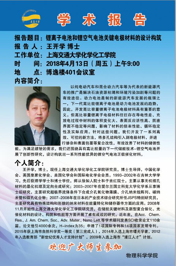2018物理前沿学术报告第八讲:锂离子电池和锂空气电池关键电极材料的设计构筑