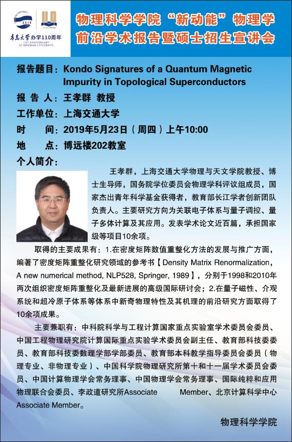 “新动能”物理学前沿学术报告暨考研宣讲6:Kondo Signatures of a Quantum Magnetic Impurity in Topological Superconductors