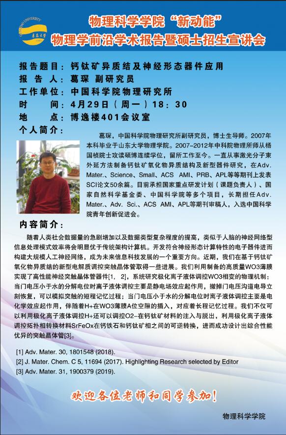 “新动能”物理学前沿学术报告暨考研宣讲2:钙钛矿异质结及神经形态器件应用