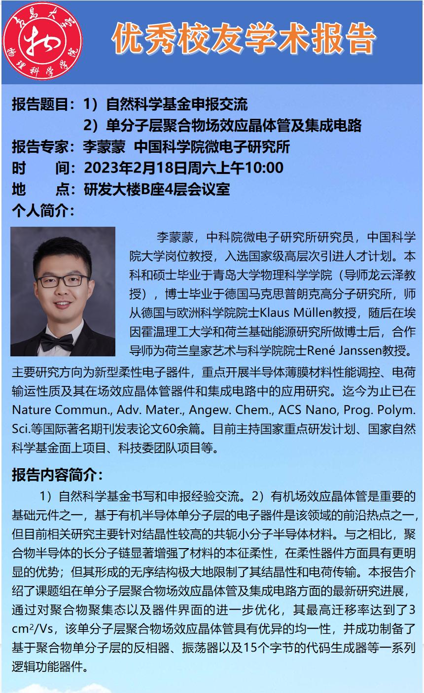 [学术活动]李蒙蒙-自然科学基金申报交流及单分子层聚合物场效应晶体管及集成电路