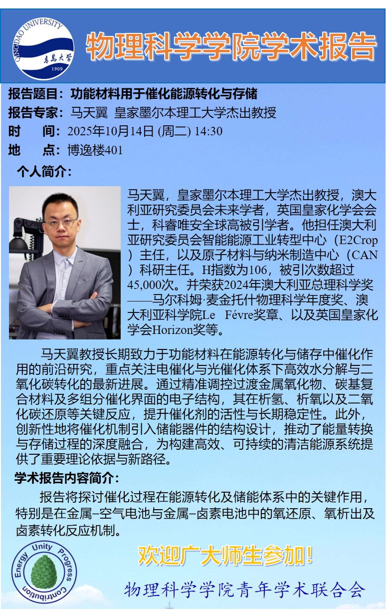 [学术预告]马天翼-功能材料用于催化能源转化与储存