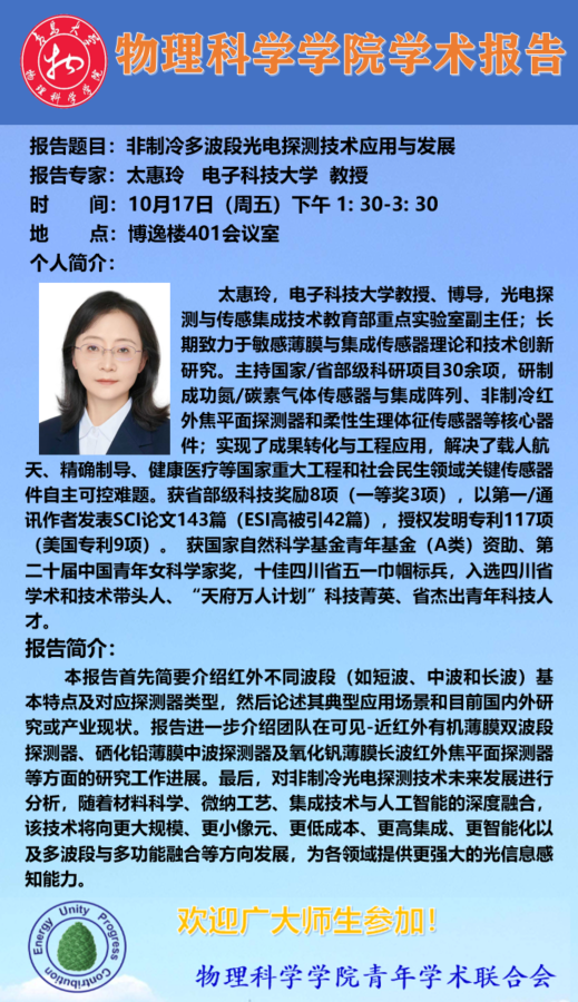 [学术预告]太惠玲-非制冷多波段光电探测技术应用与发展