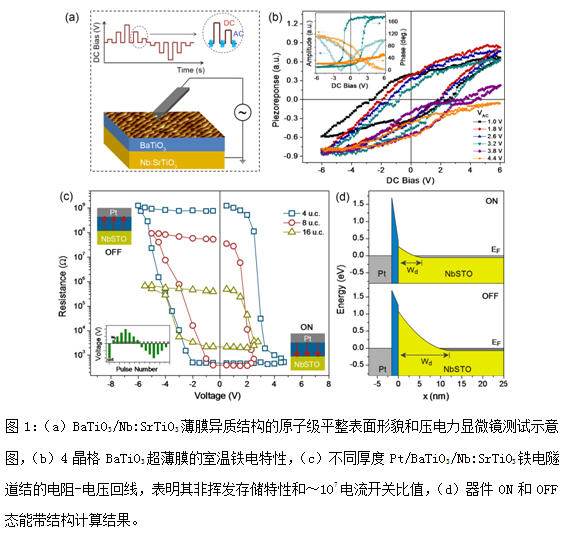 ON/OFF电流开关比是铁电隧道结的关键性能参数,比值越高越具应用价值。人们虽然通过多种方法来提高ON/OFF开关比,但相比商业化指标依然存在差距。温峥课题组制备了金属/超薄铁电体/半导体结构铁电隧道结,注意到该结构中半导体电极的Schottky势垒对器件输运特性具有显著调控能力,通过精细控制微结构参数系统优化了隧道结的能带结构。他们成功制备了1.6 nm(4个晶格)极限厚度的高质量BaTiO3铁电薄膜,并以此作为输运调控层,形成了Pt/BaTiO3/Nb:SrTiO3铁电隧道结,有效优化了Schottky势垒形貌,获得了千万量级(~6.0×106)的ON/OFF电流比值,这一性能已经能够和FLASH存储技术相比拟,显示了巨大的商业化应用潜力。