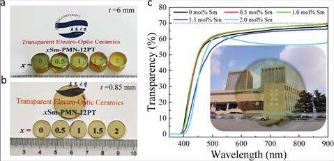 与传统电光材料LiNbO3、PLZT、LGS、BBO、KDP相比,豫铁电体铌镁酸铅-钛酸铅(PMN-PT)具有电光系数大、半波电压低、激光损伤阈值高、响应速度快等优点,是制备大功率、高速率电光调制器的理想材料,在空间光通信、强场激光物理、星载激光雷达、激光武器、材料激光加工等领域有重要应用前景。西安交通大学李飞等人通过交流极化工艺制备了兼具高压电系数、高电光系数和理论极限透光率的PMN-PT单晶,为研制高性能电光调制器、光学相控阵和量子光学器件提供了全新的关键材料,入选了2020年度中国科学十大进展。与单晶相比,陶瓷具有制备周期短、生产成本低、掺杂浓度高、组分均匀、器件加工简单、可制成尺寸大、形状复杂的制品等优点。但是高度透明陶瓷的制备非常困难,大大限制了PMN-PT透明陶瓷的应用。目前仅有美国Boston应用科技公司制备了高度透明PMN-PT陶瓷,并研发出一系列高性能电光器件,而国内尚未见实用化PMN-PT透明陶瓷及器件的报道。