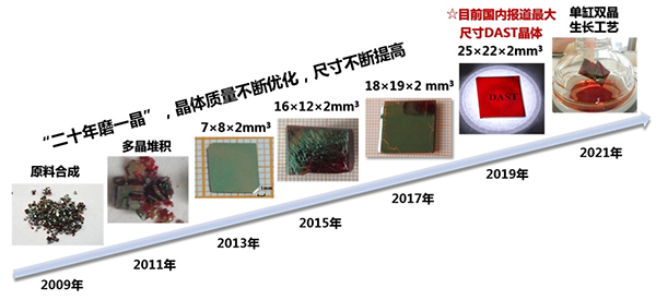 该团队一直秉承“提升自主创新能力,主动掌握核心技术”的理念,以满足国家和区域战略性需求为目标,先后汇聚了6名青年博士,发挥团队“有组织科研”的优势,不断创新突破。坚持有机太赫兹晶体研究,先后攻克高纯原料合成和提纯工艺难题,实现晶体原料自主制备和设备自主研制,生长出目前国内最大尺寸的 DAST 晶体,并实现成果转化,为国内外十余家宽频太赫兹技术研究单位提供核心晶体材料器件。团队通过产学研合作,建立中试基地1个,孵化创新企业1家。