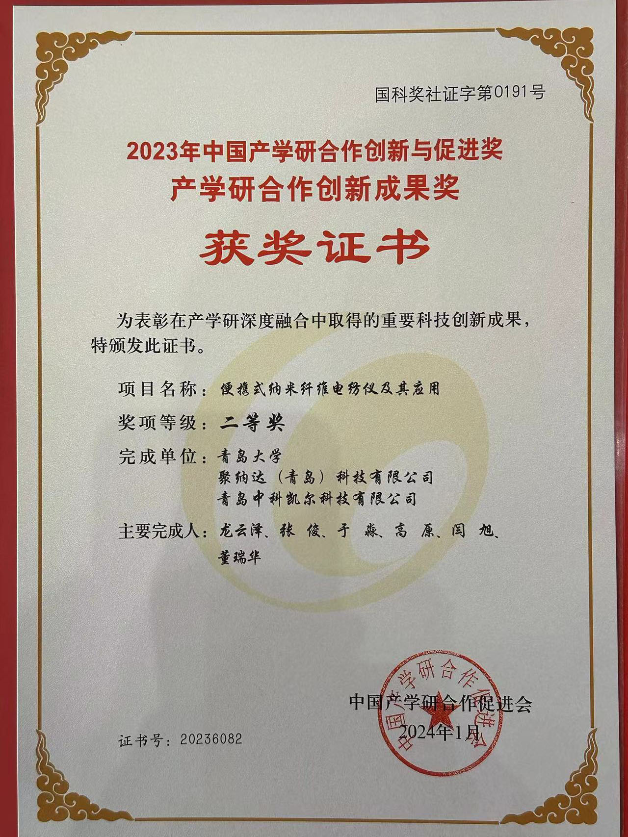 龙云泽、张俊团队的成果《便携式纳米纤维电纺仪及其应用》荣获2023年中国产学研合作创新成果奖二等奖。