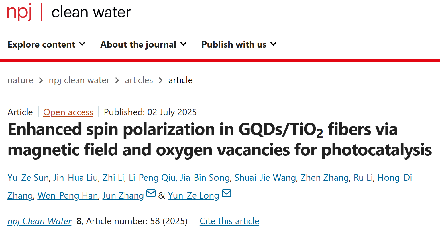 龙云泽/张俊课题组在《Nature》旗下刊物《npj Clean Water》(2025,8:58)上发表了题为《Enhanced spin polarization in GQDs/TiO2 fibers via magnetic field and oxygen vacancies for photocatalysis》(通过磁场和氧空位增强石墨烯量子点/二氧化钛纤维中的自旋极化用于光催化)的研究论文。论文第一作者是硕士研究生孙玉泽和博士研究生刘进华,通讯作者是张俊副教授和龙云泽教授。《npj Clean Water》的SCI影响因子为11.4,2024年发文量仅130篇。