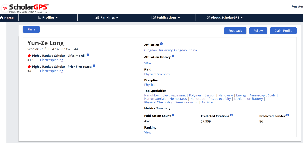 近日,国际学术评价机构 ScholarGPS发布了2025年全球学者排名,以“终身”为统计周期,h动漫 龙云泽教授在“静电纺丝”领域全球排名第十二,以“过去五年”为统计周期,龙云泽教授在“静电纺丝”领域全球排名第四。该排名基于全球超过3000万学者和12000家科研机构的科研产出、学术影响力及引用质量进行量化分析,数据库覆盖2亿篇出版物和30亿次引用,是国际公认的完全量化学术排名体系。