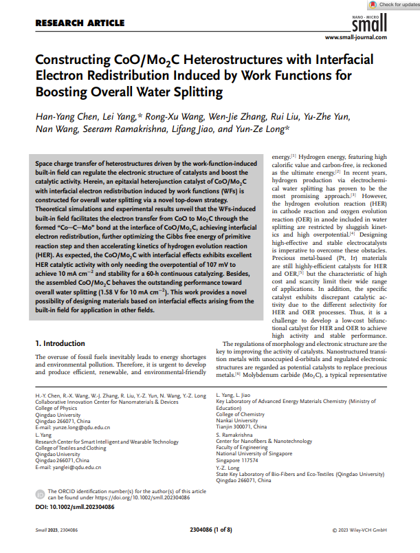 新能源科学与工程专业2020级本科生陈汉阳在中国科学院1区TOP期刊Small(影响因子13.3)以第一作者身份发表了题为“Constructing CoO/Mo2C Heterostructures with Interfacial Electron Redistribution Induced by Work Functions for Boosting Overall Water Splitting(构建由功函数诱导界面电子再分布的氧化钴/碳化钼异质结构促进整体水分解)”的研究论文(Small, 2023, 2304086)。纺织服装学院杨磊副教授与h动漫