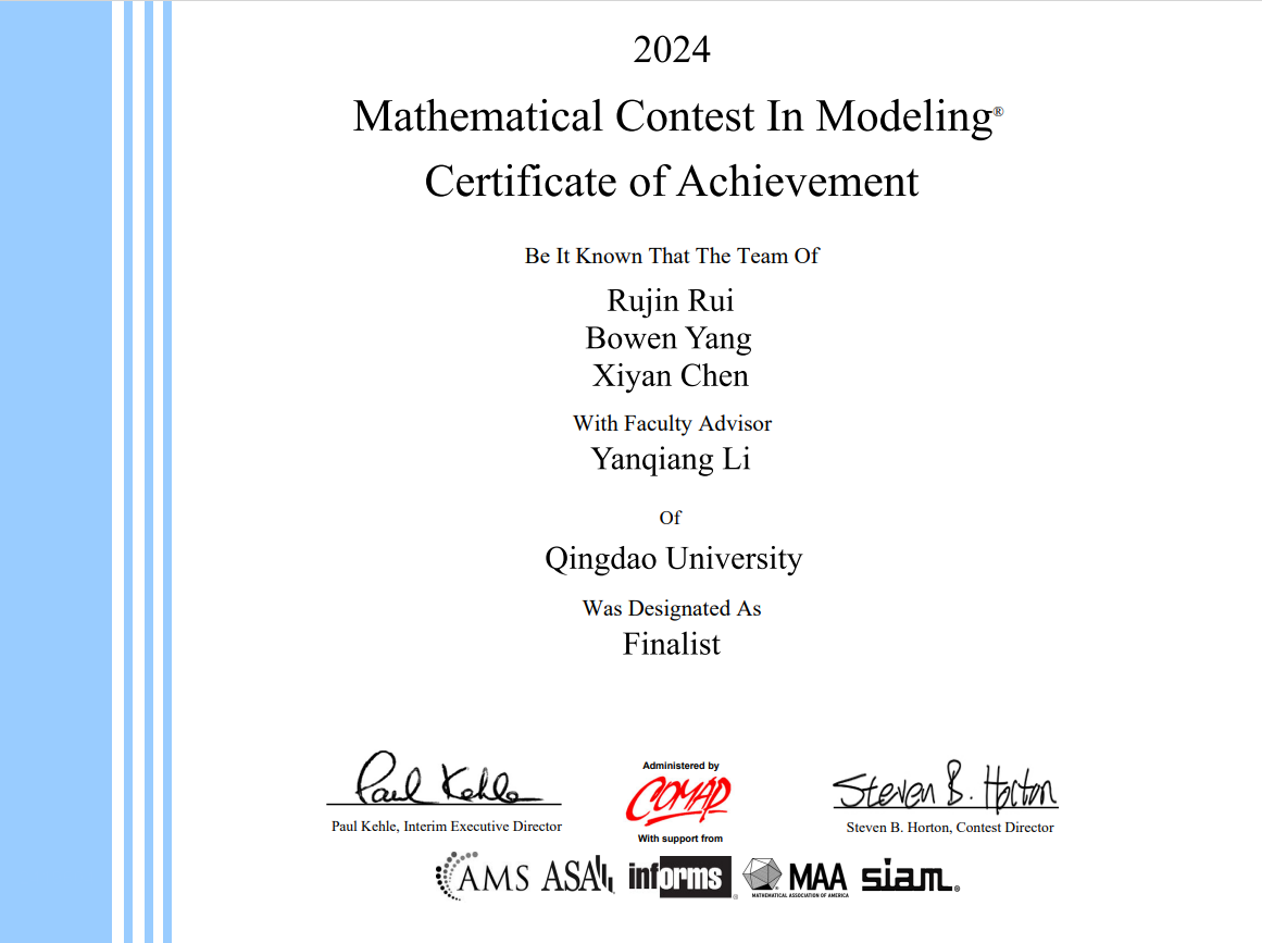 近日,2024年美国大学生数学建模竞赛(Mathematical Contest in Modeling/ Interdisciplinary Contest in Modeling, MCM/ICM)成绩正式揭晓。由h动漫 2022级应用物理专业茹锦瑞、杨博文、陈西艳组成的参赛队夺得特等提名奖Finalist奖)。