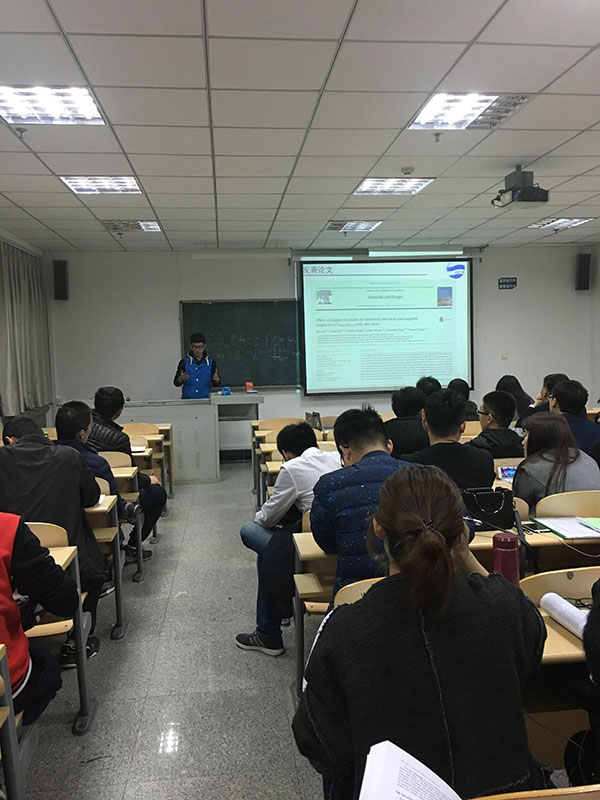 2014级研究生刘宾在浩园307教室作了题为“钙钛矿功能氧化物薄膜LSCO的微观结构和性能研究”的学术报告。学院2016级全体研究生共50余人参加了学术报告会。报告会由学院副院长滕冰教授主持。