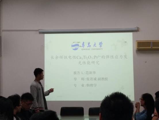 2015级研究生范新华在博逸楼401会议室作了题为《长余辉铁电性Ca3Ti2O7 :Pr 3+的弹性应力发光性能研究》的学术报告。学院2017级全体研究生参加了学术报告。报告会由胡琛老师主持。