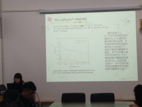 窦晓丹从固态激光器发展与应用、Yb:LuPO4 /GaAs调Q、Yb:LuVO4 /Cr4 +:YAG 调Q以及Yb:LuPO4与Yb:LuVO4研究比较四个方面进行了详细论述。 尽管Yb:LuPO4和Yb:LuVO4晶体拥有相同的晶格结构和局部对称性,激光特性的差异却很明显。这表明其他因素也在决定光谱和激光特性方面起关键作用,包括共价效应、电子-声子相互作用等。在激光性能方面,Yb:LuPO4优于Yb:LuVO4,因为它能更容易的实现高效的激光运转。表明了Yb:LuPO4晶体制造微芯片或微型棒激光器方面的巨大潜力。报告会后,就相关问题与大家进行了讨论交流。