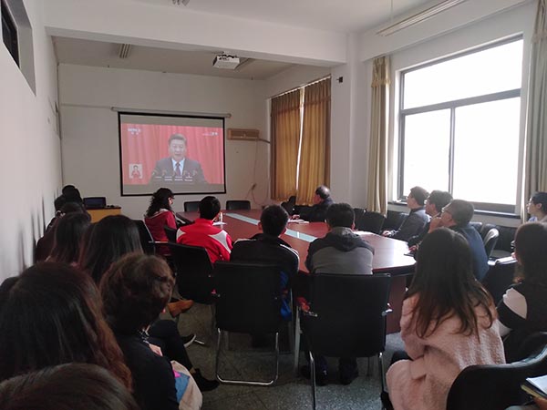 10月18日上午,h动漫 在博逸楼401会议室统一收看了党的十九大开幕式实况。学院党政领导黄国俊、滕冰、周志强、王乙潜,各系(中心)主任和副主任、各支部书记和副书记、机关全体工作人员、部分教职工以及学生党员代表等40余人参加了收看活动。