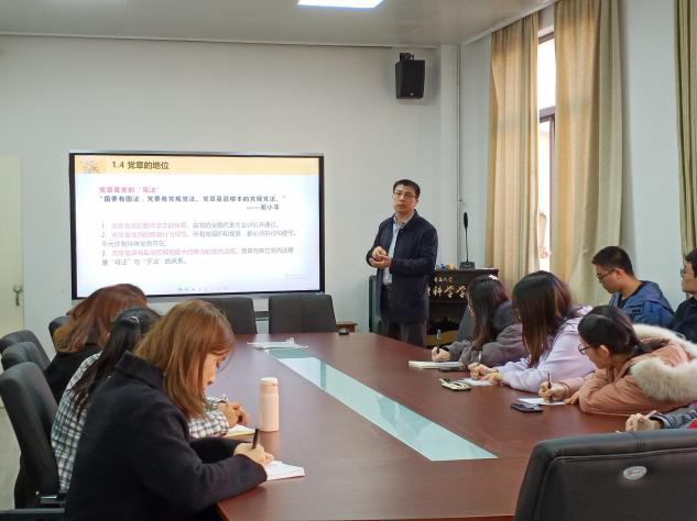 入党积极分子秋季党课培训班第二课在博逸楼401会议室开课 。院党委书记李升学为入党积极分子主讲了题为《中国共产党章程》的党课。2018、2019级入党积极分子参加学习。