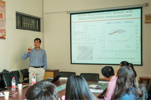 401会议室,为全院师生分别作了题为《Integrated Ferroics for Sensing,Power,RF.Microwave and mm-Wave Electronics》和《自旋传感器的研发和在消费电子和生物检测的应用》的学术报告,报告会由李山东教授主持。