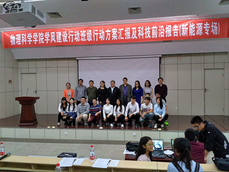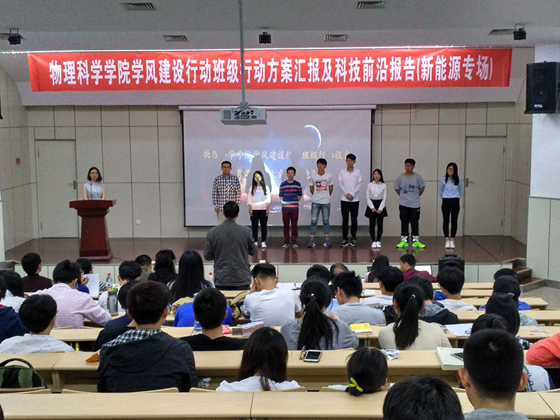 学风建设行动迎来了第二场班级行动方案汇报及科技前沿报告——新能源科学与工程专场,整场报告从现场布置、主持、报告等全部工作由该专业2013、2014和2015级三个年级合作完成,本专业全体同学参加。活动邀请各班级班主任担任评委,系主任担任点评嘉宾。此次活动学院党委书记黄国俊、副院长滕冰及部分任课教师和辅导员到场参加。