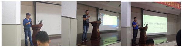 何春雷校友首先介绍了自己的工作经历和公司研发的环境监测方面的产品,讲解了环境监测颗粒物方面的检测仪器和原理,如粒径谱仪、激光雷达等,倡导大家以后最好从事学术研究或加入到一些企业,企业不仅能够提供就业机会,还能实现人生价值。