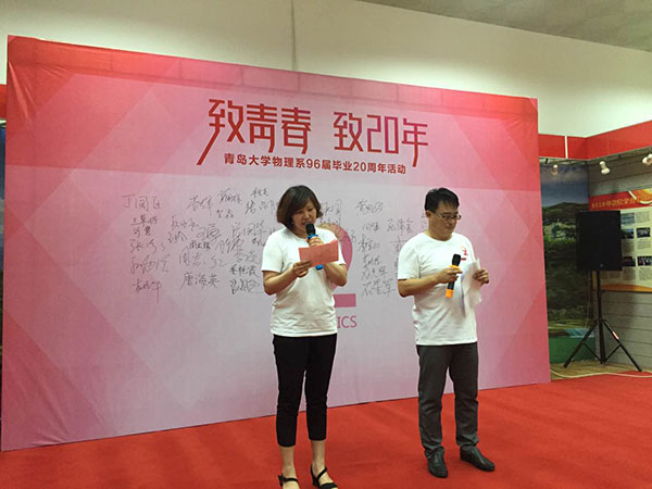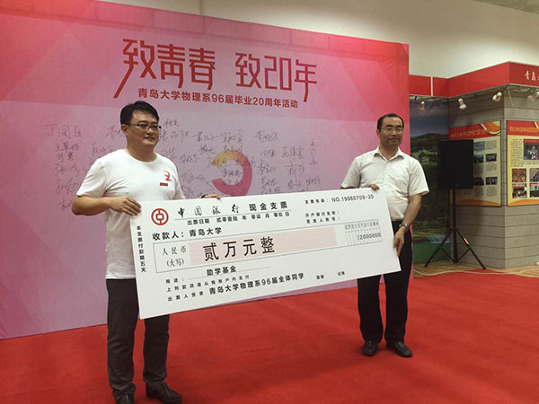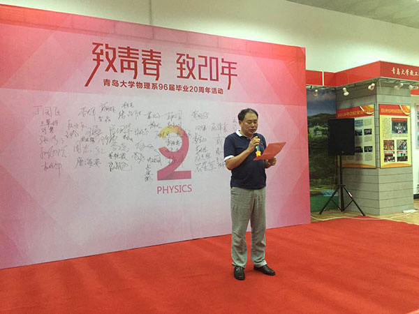 的老师和师弟师妹们,向你们表示热烈的欢迎!——欢迎你们回家!接着,他向同学们简要介绍了学校和学院20年来发生的变化和取得的成绩。最后他说,母校的建设和发展所取得的成就,离不开你们给予的鼎力支持。在这里,我代表母校对你们倾注的深情厚意表示诚挚的感谢!也希望你们以后在各自岗位建功立业的同时,始终不忘关注母校的发展,积极建言献策!也希望同学们能够一如既往地常回家看看,母校永远是你们的家!92级物理的同学们还向学院捐款,用于助学基金。